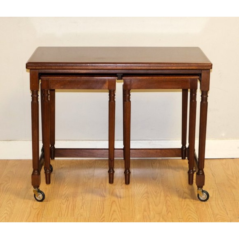 This beautiful set offers you a medium sized table which opens up to display a doubled top space. Along with a lovely pair of side tables, that is able to slide away for a smart storage solution when it is not in use. The tables are raised turned and reeded legs and the main tables are supported on castors for an easy movement. The set are all in good condition.
