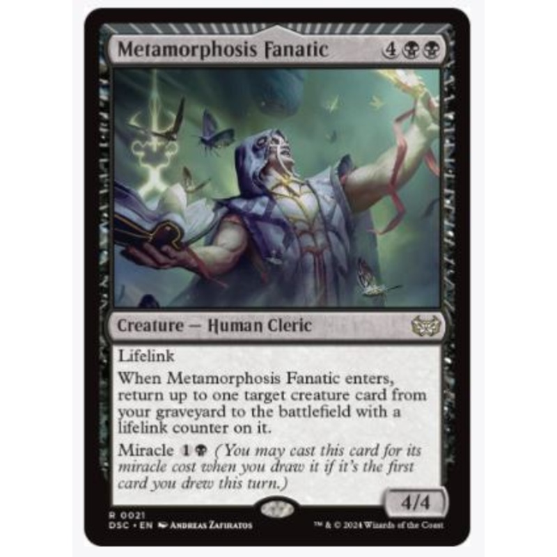 LifelinkWhen Metamorphosis Fanatic enters, return up to one target creature card from your graveyard to the battlefield with a lifelink counter on it.Miracle 1BRarity:R#:21Card Type:Creature Human ClericP / T:4 / 4Casting Cost: 4BB