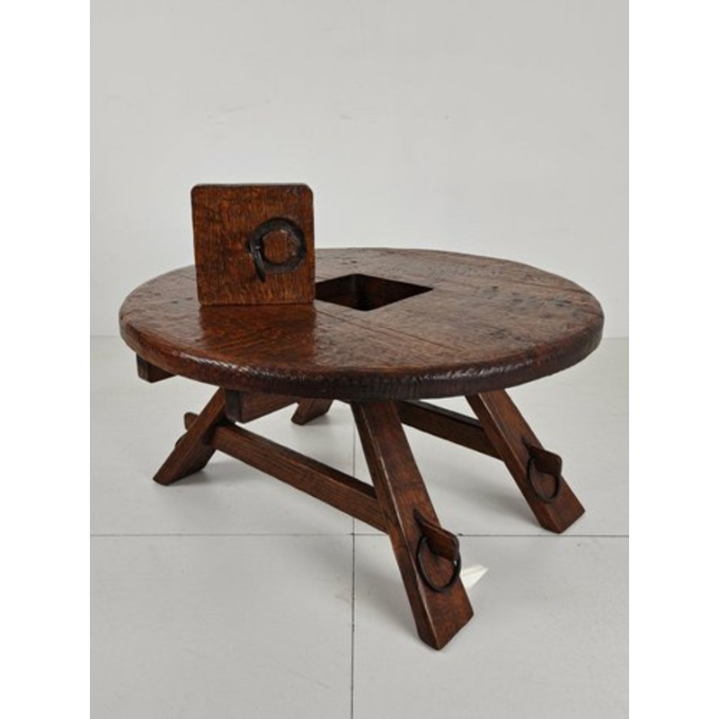 Originating from France circa 1950, this exceptional coffee table showcases a stunning rustic aesthetic. Crafted from solid oak, it embodies the bold and raw charm of Brutalist design. A distinctive feature is the ring pull lift-up lid in the center of the tabletop, adding both functionality and character. Its sturdy construction and timeless appeal make it a unique statement piece for any interior. Dimensions: Length 90 cm x Width 90 cm x Height 48 cm.