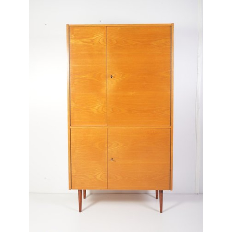 Block-board wood veneered with ash, beech legs, thoroughly cleaned inside out, surface re coated with 6 layers of hard wax oil, back panels cleaned, shelves recoated. Originally designed for small appartments and produced by furniture maker known mainly for high quality pieces from Jindrich Halabala. See other complementing parts.