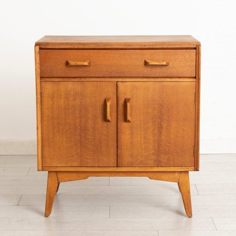 A midcentury oak cupboard from the Brandon range by G-Plan. The rectangular form features a single drawer with sculpted wooden handles above a two-door cabinet, offering storage with an internal shelf. Raised on splayed legs, the design reflects British midcentury craftsmanship with clean lines and functional proportions. The oak grain is highlighted by a warm finish, making it a versatile storage piece suited to various interiors. H: 84.5cm W: 76.5 cm D: 46cm