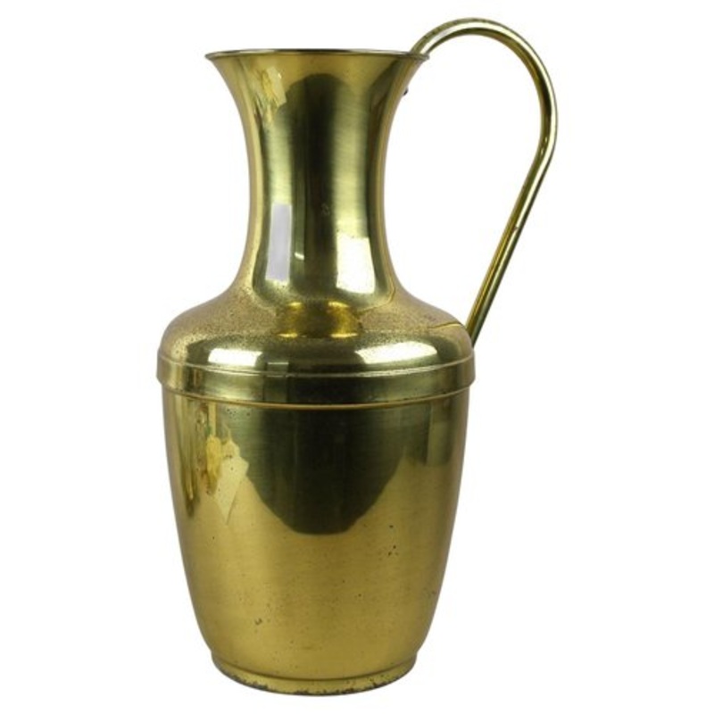 Fantastic, large mid century amphora brass vase with handle from the 1940/50s in Austria. This decorative, brass vase has a height of 21.2″ and impresses with its elegantly shaped body and the artfully curved handle. The beautiful shining brass surface shows a charming patina here and there and definitely attracts attention to every viewerss eye. The top opening has a diameter of 7″ and holds an additional plastic insert/ vase so you can put water in it and also use it for fresh cutted flowers. Another option to use this gorgeous mid century brass floor vase is for example as a fancy umbrella stand.
