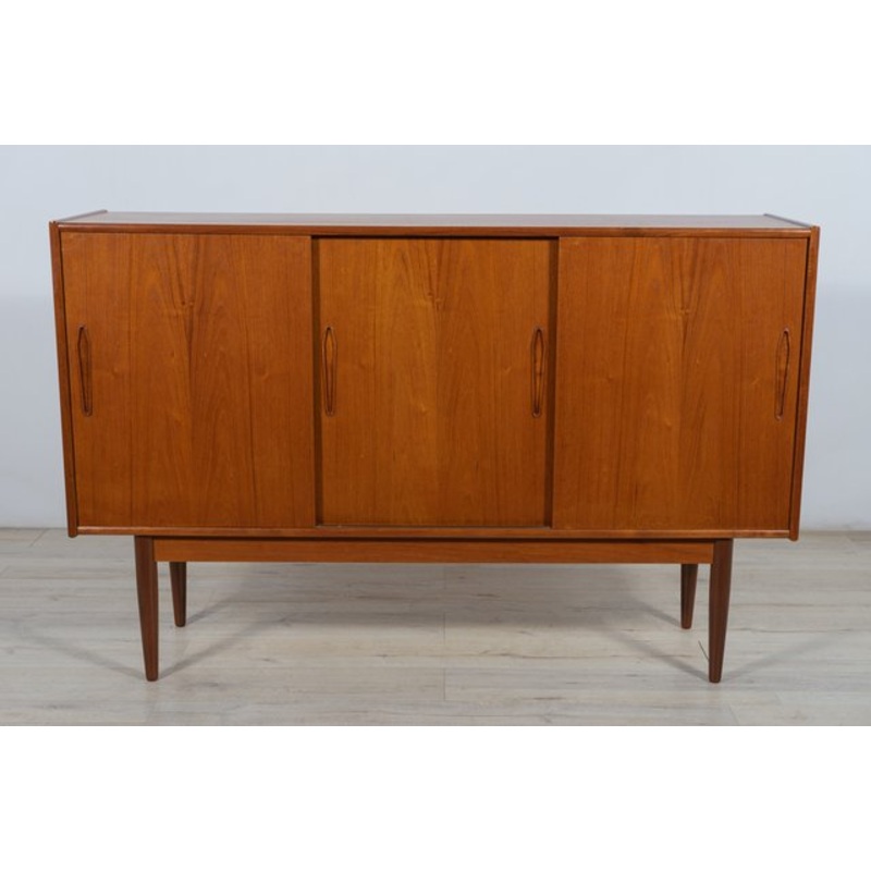 Danish highboard produced in the 1960s. The chest of drawers consists of three sliding doors, inside the chest of drawers there are shelves. Highboard has contoured handles. The highboard has been completely renovated, cleaned of the old surface, and finished with Danish Rustins Oil.