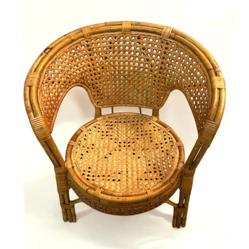 French vintage chair with elegant handwoven rattan detailing Sturdy bamboo frame with intricate cane weaving for a timeless aesthetic Naturally aged patina that enhances its unique character.. Dimensions: H 70 cm W 66 cm D 62 cm..A rare collectors piece th