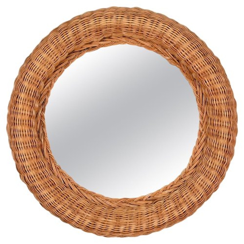 Beautiful mid-century organic round mirror completely made in hand-woven wicker. This delightful French Riviera style mirror was produced in Italy during the 1970s. In amazing condition and with a charming color, this mirror has a round concave frame made in hand-woven wicker, the internal part nearby the mirror is enriched by a braid in wicker. The back of the mirror is completed by a protective panel in wood. The perfect proportions and the stylish design make this mirror a must have for modern organic or French Riviera style lovers. Diameter – 61 Depth – 7