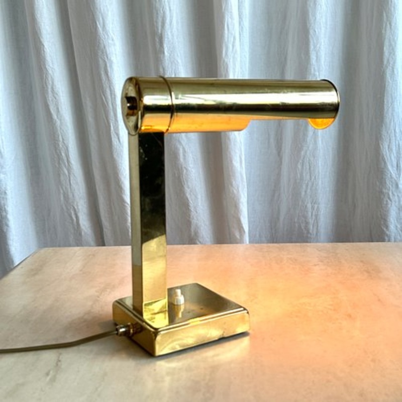 Cute German mid century brass table lamp with adjustable shade, 1960s. Prime example of fine West German product design, a piece, which consists of minimalistic, yet elegant appearance and easy-to-use high-functionality. The brass body is responsible for its aesthetic value, while the push canopy switch and adjustable (rotating) shade provide the practical value. The rectangular base and tubular shade complement each other perfectly, creating a harmonious asymmetry. Perfect piece for modern and traditional home interiors as it can be used as a display light, desk lamp or just moodlighting.