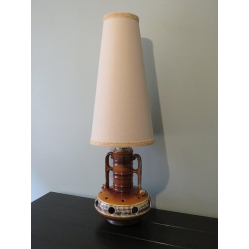 Large floor lamp in caramel-colored fat lava ceramic with beige and brown accents.The lamp has a light beige shade with a border at the bottom and top in the same shades as the shade.The base of the lamp has 2 light points, 1 at the top (E 27) and 1 (E 14)