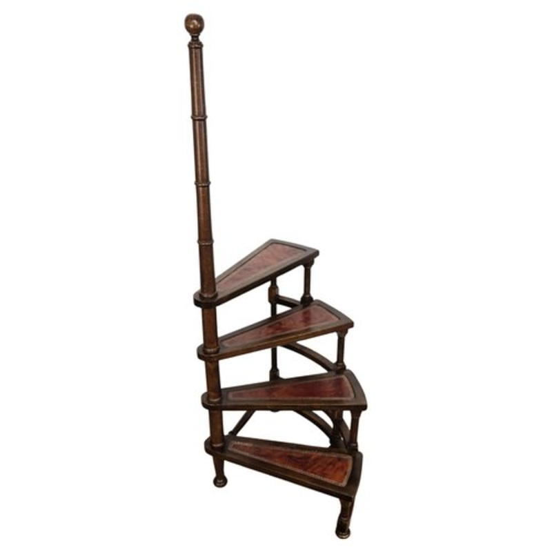 Beautiful Italian carved walnut wood circular step ladder with four stairs rolled around a turned, central pole with a decorative finial. Each step is upholstered with red leather and golden classic frame. Versatile and practical, the elegant library essential is in excellent condition with a rich walnut patina. Use this vintage staircase to organize books in your office or library, as well as in any other room that might require an additional elegant and tasteful step.
