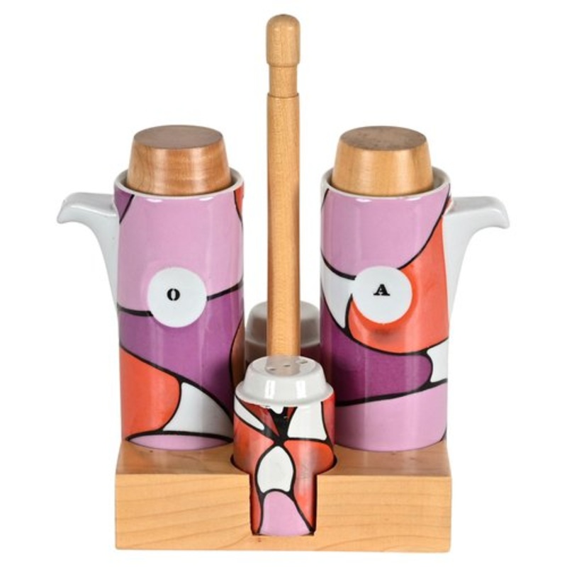 Wonderful and unique wood & vinegar ceramic set with tray in a vibrant purple and orange color combination. This delightful set was produced by Ceramiche Franco Pozzi in Italy during the 1970s and is signed on the bottom and each piece still has its original label on a side. In fabulous condition, with no chips or cracks. The painted ceramic features a bold and dynamic pattern in vibrant orange and purple tones, beautifully contrasting with the natural wood base. The high-quality craftsmanship and the sleek, modernist design makes it a true collectors piece that embodies the essence of 1970s Italian design The set includes an oil dispenser, a vinegar dispenser and a salt and pepper shaker. Completed by its original beechwood tray. Perfect for adding a touch of color and elegance to a kitchen or dining table, this set is both functional and decorative. Dimension (cm): Width – 19 Depth – 11 Height – 22