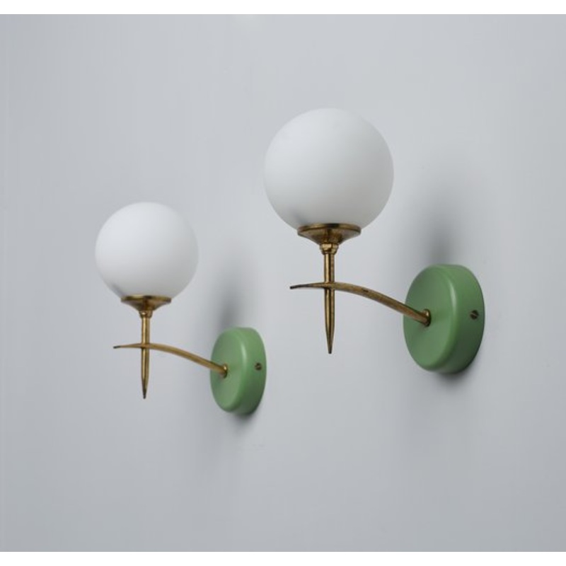 This sophisticated pair of Italian wall sconces, designed in the 1950s, captures the essence of modernist elegance. Constructed from brass with an original patina that adds character and depth, the sconces are mounted on brass wall fixtures, lacquered in green for a pop of color.