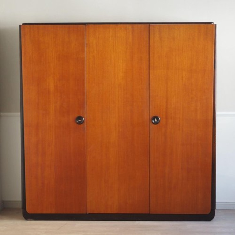 To match our 2-door midcentury cabinet, we offer a stylish 3-door cabinet in a midcentury modern style. This stylish vintage wardrobe from the mid-century era impresses with its clear design, warm wood tones and striking black and dark brown sides and edges. The round recessed handles underline the minimalist design and give it a modern, timeless character. Special interior equipment: Glass shelves on the left, a long clothes rail and hat rack on the right. Material: Solid wood with high-quality veneer Dimensions in cm: Height: 182 / Width: 179 / Depth: 59 cm Origin: Made in what was then Czechoslovakia, an example of the precise craftsmanship of this era. Features: Simple, round recessed handles and a spacious interior for versatile use Wide hinged doors, classic mid-century design with minimalist lines, warm wood tones and modern contrasts Condition: The cabinet is in very good condition. There are minimal, age-related signs of wear that underline the vintage character of the furniture. The doors and hinges function properly and the interior is clean and well preserved.