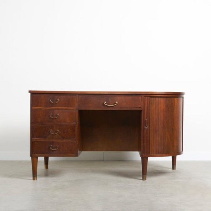 Midcentury danish design desk with bar. Walnut with capped legs and brass pulls.