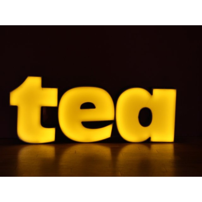 Old, decorative illuminated letters made of yellow and white acrylic glass and metal. Fluorescent tubes replaced by energy-saving LED strips.