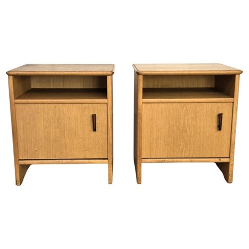Very elegant and refined Italian 1950s Mid-Century Modern pair of bedside tables with top shelf and door with beautiful brass and red lacquered handles. Those pieces make a great look in any style bedroom, as a complementary design or as a contrast piece i