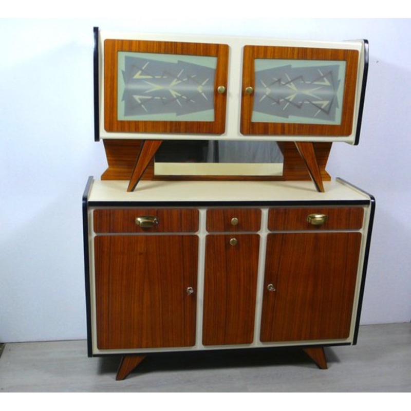 Exceptional 1950s rockabillyKitchen cabinet in cream and rosewoodWood veneer, with sprayed decoration on theGlass doors in mint and cream, from theMid Century Modern era.The cabinet consists of an upper and lower part.There is a above the work surface Mirr