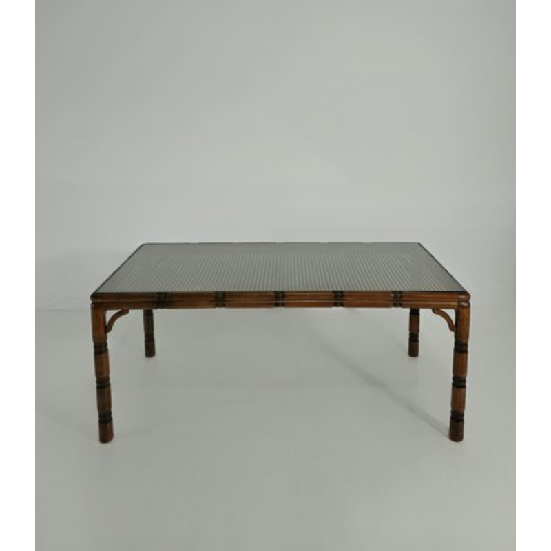 Low rectangular coffee table. Dark wood structure with bamboo effect. Rattan top covered by transparent glass.