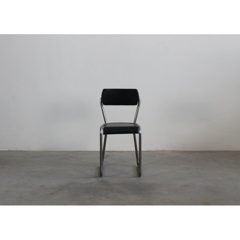This is a rare office chair featuring a metal frame and a seat and back upholstered in black leather, it was designed for the offices of the Palazzo Montecatini in Milan.The design of this chair is attributed to the Italian master Gio Ponti, who, in 1935,