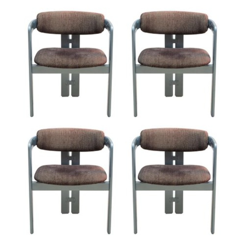Dining chairs model “Pamplona” designed by Augusto Savini for Pozzi, 1970s, Italy. Vintage 1970s Italian dining chairs. Gunmetal silver lacquer wooden frames in a U-back or horseshoe shape. Original corduroy brown-silver upholstery. Dimensions: 57 W x 69 H x 52 D cm, seat 42cm.