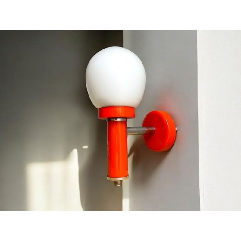 Orange Wall Sconce LampMid-century wall sconce light that is meant for hard wiring. However, there is a small opening in the base which makes it possible to attach an electrical cord for plugging into the wall socket.The lamp is made of orange lackered met