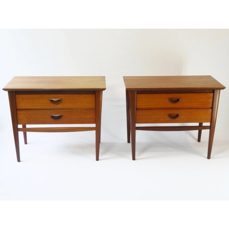 Amazing original Scandinavian set of nightstands made out of teak wood. The bedside tables have two drawers each and a very nice futuristic design overall. The handles of the drawers give a nice touch and are typical details of furniture manufactured in De