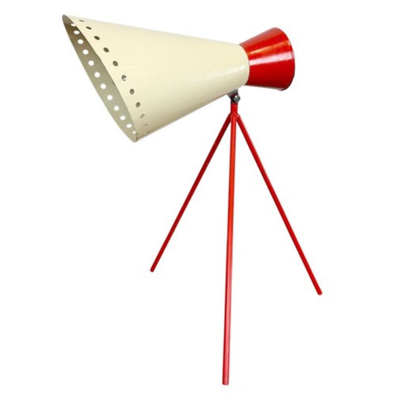 It features a beige metal shade and a red iron tripod.The socket requires E14 lightbulb. Unoriginal switch is situated directly on the lamp.The diameter of the lampshade is 12 cm. The weight is 0,5 kg. New textile wire.