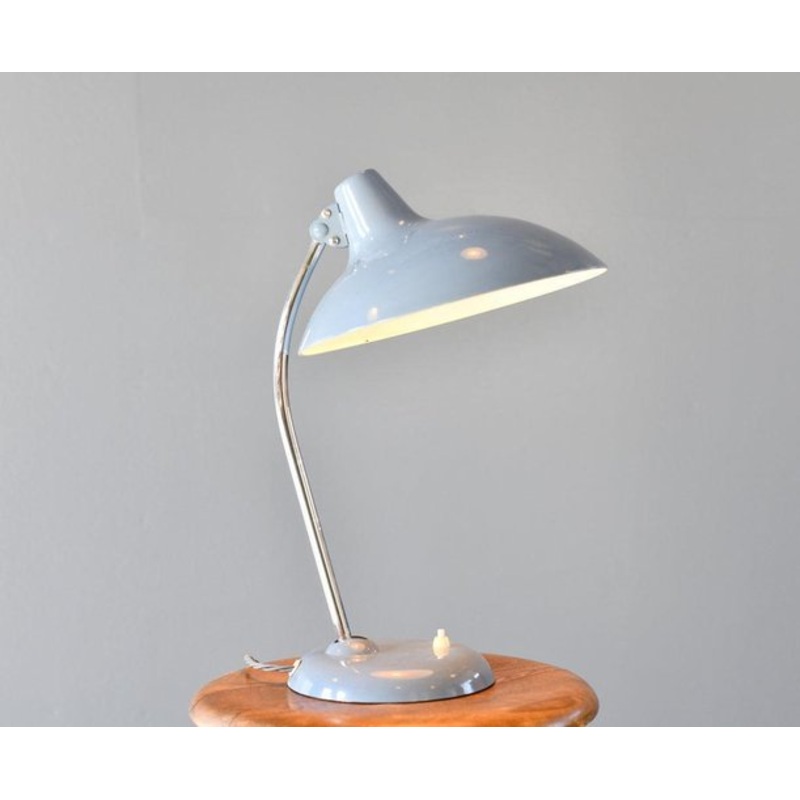 Mid Century Table Lamp By Kaiser Leuchten Model 6786 Circa 1950s Steel shade and base - Chrome arm - Original grey paint - Takes E27 fitting bulbs - On/Off switch on the base - Made by Kaiser Leuchten, Neheim - Model 6786 "Witches hat" - German ~ 1950s - 2