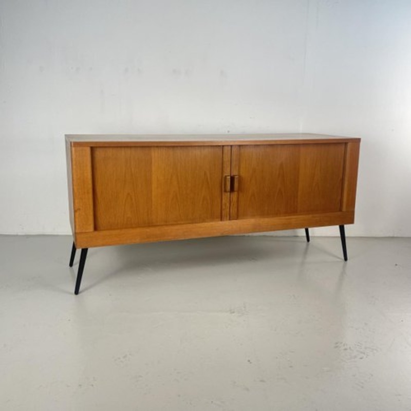 Nice compact teak Midcentury sideboard / Hifi record cbinet with tambour roller doors. with slide out drawer to put your record player on and hole in back for cables. On black metal legs which may have been added more recently. Approximate dimensions: Height: 72.5cm Width: 152.5cm Depth: 53.5cm Drawer: 57cm W x 37cm D x 11.5cm H. Slide out shelf 58.5cm x 41cm In very good condition.