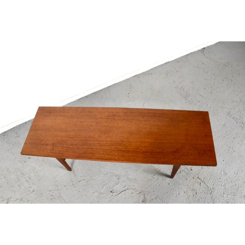 Vintage Danish style teak slatted coffee table for sale. Designed and manufactured in the UK, this table features a fantastic design and great quality. Tapered legs give this table the characteristic look of its era.It is a fantastic piece and of great qua