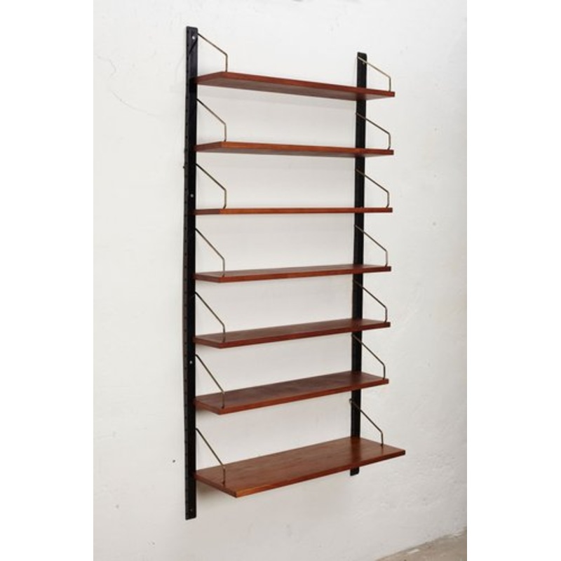 This Danish wall unit features six shelves (80cm x 20cm) and one larger shelf (80cm x 31cm), which can also be used as a small desk space.The shelves are made of teak veneer with solid brass hangers, while the solid beech wall brackets are painted black.Th
