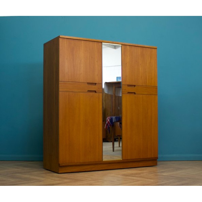 A freestanding double door teak wardrobe from Uniflex - designed by Gunther HoffsteadMade during the 1960sFitted out with two clothes rails and shelvesThe style of this wardrobe is quite minimalist - with it's clean lines There's a full mirror to the middl