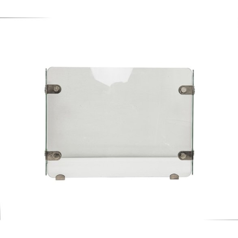 It has three rectangular panels of clear translucent glass with rounded corners connected by two pairs of brass hinges. The glass panels also stand on brass feet.