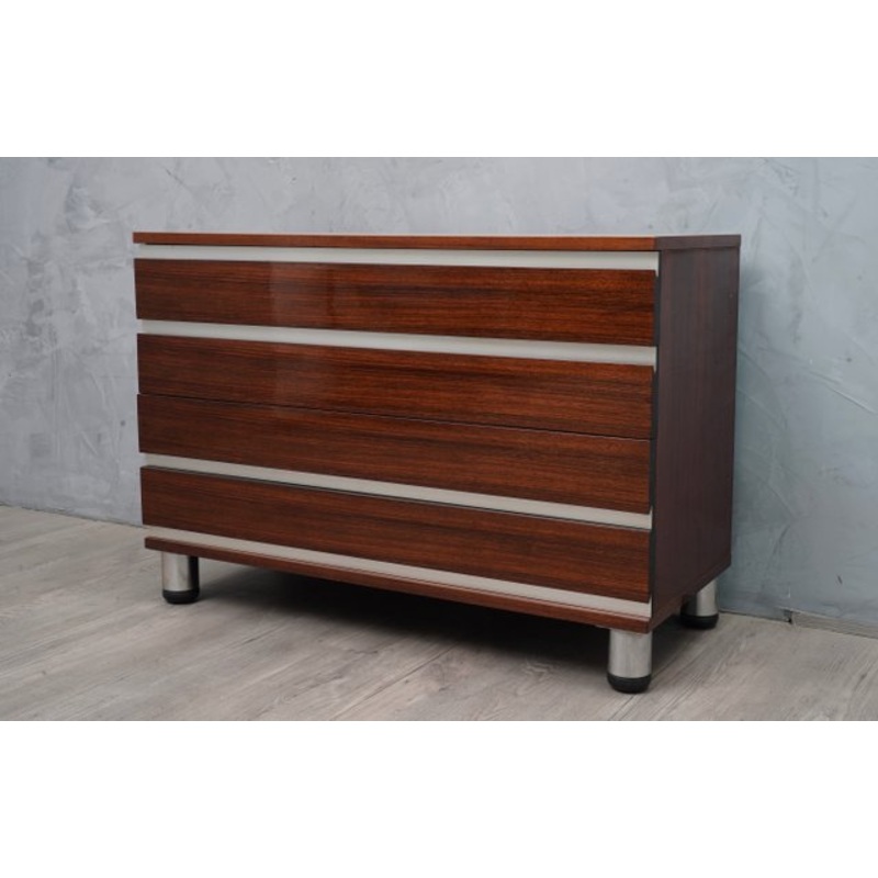 The dresser is made of walnut wood, with special aluminum finishes. It has four very beautiful and above all functional drawers. It has been completely re-polished, and has a beautiful patina, as can be seen from the wood grain. Among the most sought-after designers by collectors around the world, in the 1930s Osvaldo Borsani took on the role, even before graduating in architecture, of artistic director of the company founded in Brianza in the 1920s by his father Gaetano. If in the 1940s the company adopted increasingly streamlined lines, the 1950s marked a radical turning point, thanks to Osvaldo’s collaboration with his brother Fulgenzio, towards mass production.