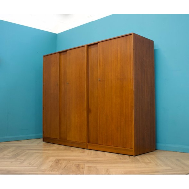 A mid century freestandingtriple door teak veneer wardrobe, circa 1960sConsisting of two separate wardrobes stood togetherThey can be stood independently of each otherEach has a rail the full width - one also has shelves Design Period 1960 to 1969 Year Pro