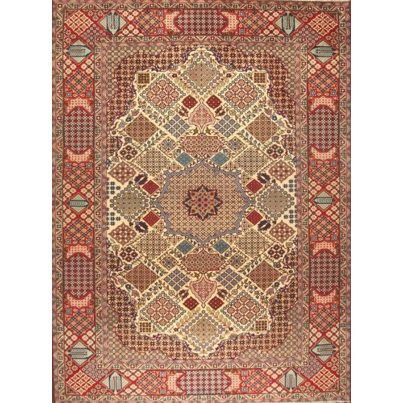 Real hand-knotted rug | Size: 394 x 290 cm | Knot density: approx. 160,000 knots/m | Material: 100% wool (pile), 100% cotton (warp) | Pattern: Floral with Medallion | Condition: Used, good condition | Origin: Isfahan | Age: approx. 10 years | Suitable for underfloor heating