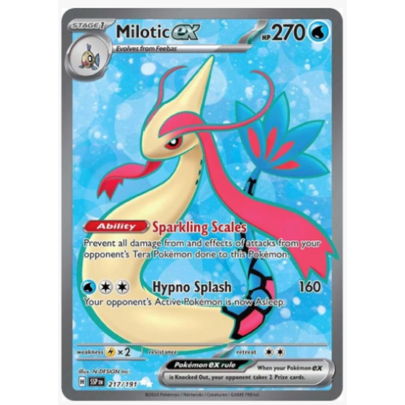 Card Number / Rarity:217/191 / Ultra RareCard Type / HP / Stage:Water / 270 / Stage 1Card Text:Ability: Sparkling ScalesPrevent all damage from and effects of attacks from your opponent's Tera Pokmon done to this Pokmon.Attack 1:[WCC] Hypno Splash (160)You