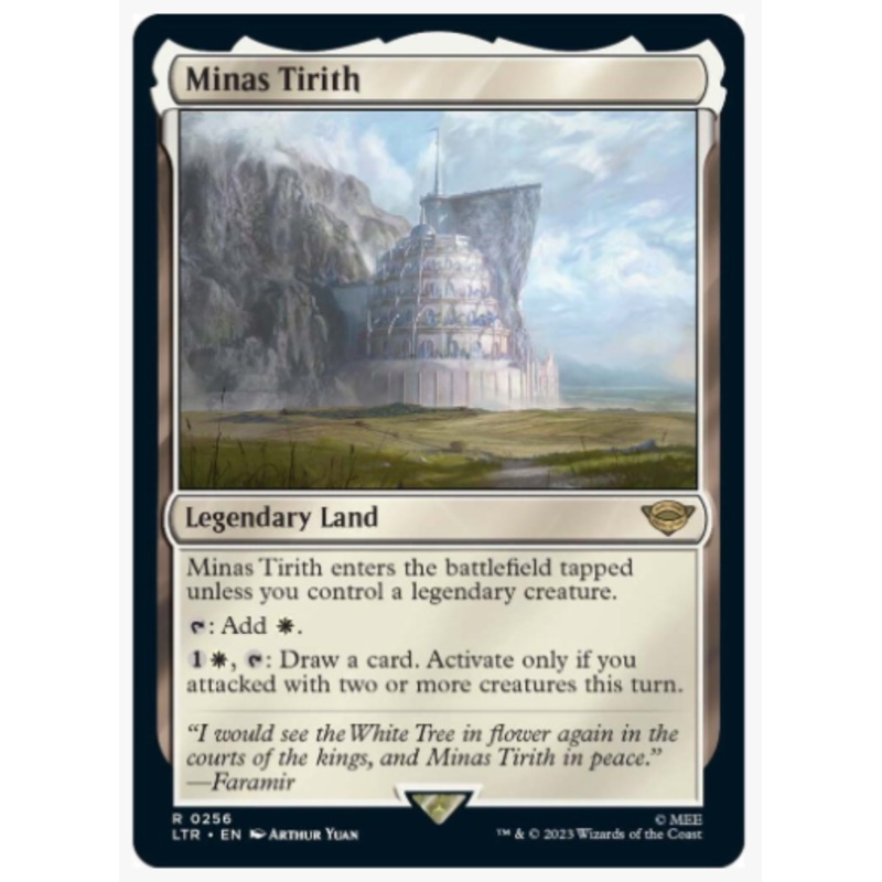 Minas Tirith enters the battlefield tapped unless you control a legendary creature.T: Add W.1W, T: Draw a card. Activate only if you attacked with two or more creatures this turn.Rarity:R#:256Card Type:Legendary LandFlavor:"I would see the White Tree in fl