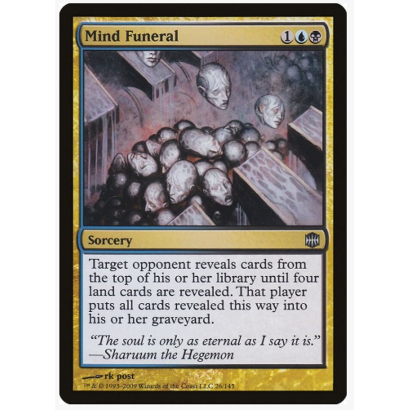 Target opponent reveals cards from the top of his or her library until four land cards are revealed. That player puts all cards revealed this way into his or her graveyard.Rarity:U#:26Card Type:SorceryFlavor:"The soul is only as eternal as I say it is."Cas