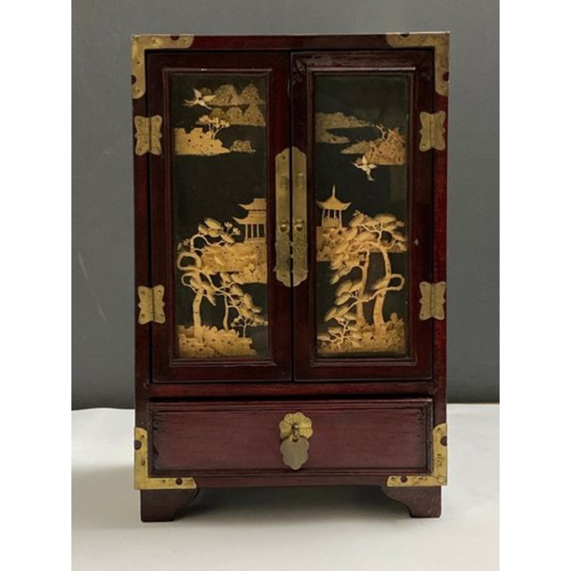 This cabinet is made of lacquer, it is decorated with Lige, protected by two tiles. It was probably used to store jewelry. He is of good quality. It is to be located around 1950-1960.