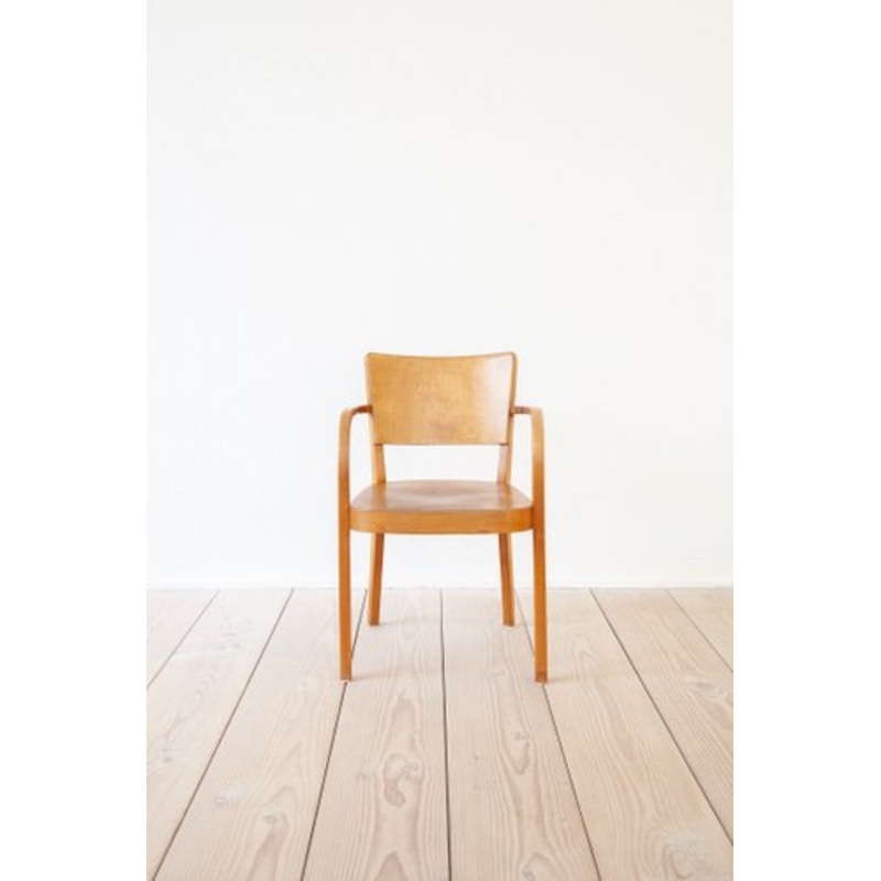 The Model 1-790a armchair was designed by Hans Ernst Haefeli in 1926. The piece on offer is an early version from the 1930s/1940s and was manufactured by horgenglarus in Switzerland. The chair has aged wonderfully and has a great, honey-colored patina. Cre