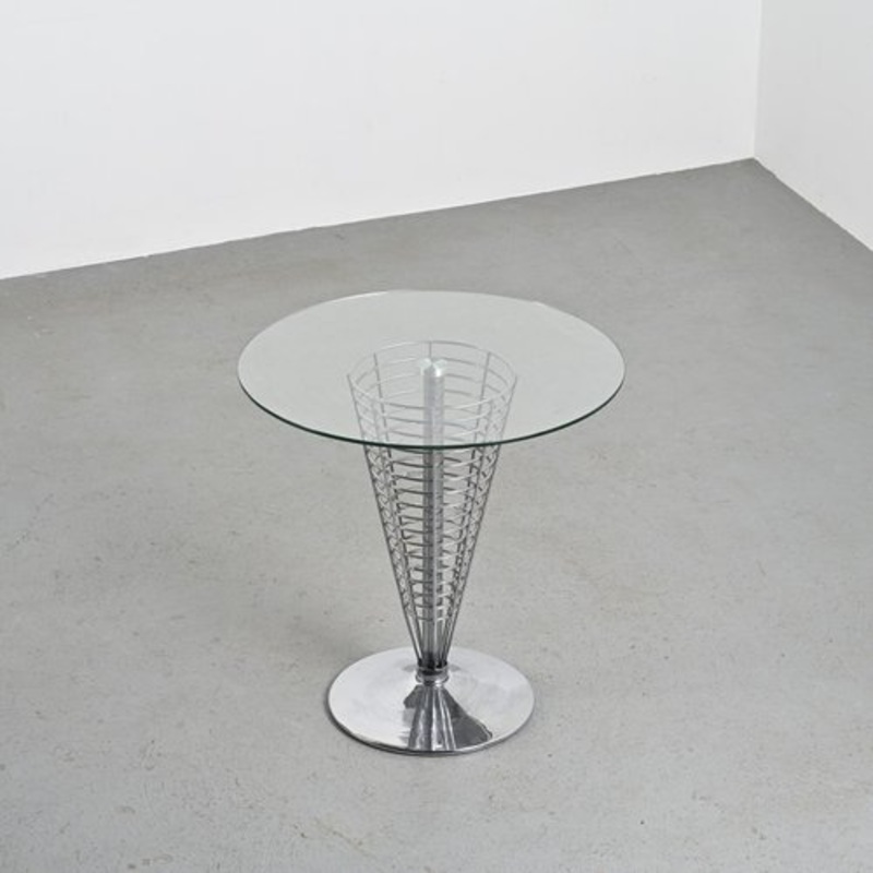 8820 table designed in 1988 by Verner Panton for Fritz Hansen.This version of the Cne table is distinguished by its elegant glass top, which enhances the chrome wire structure. The steel frame, light and airy, contrasts harmoniously with the transparency o