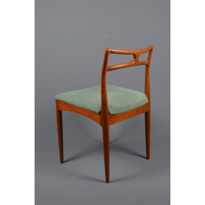 Great design. The teak wooden frame has been refinished an is in very good condition. The chair has been reupholstered with a good quality, durable fabric. Beautiful piece