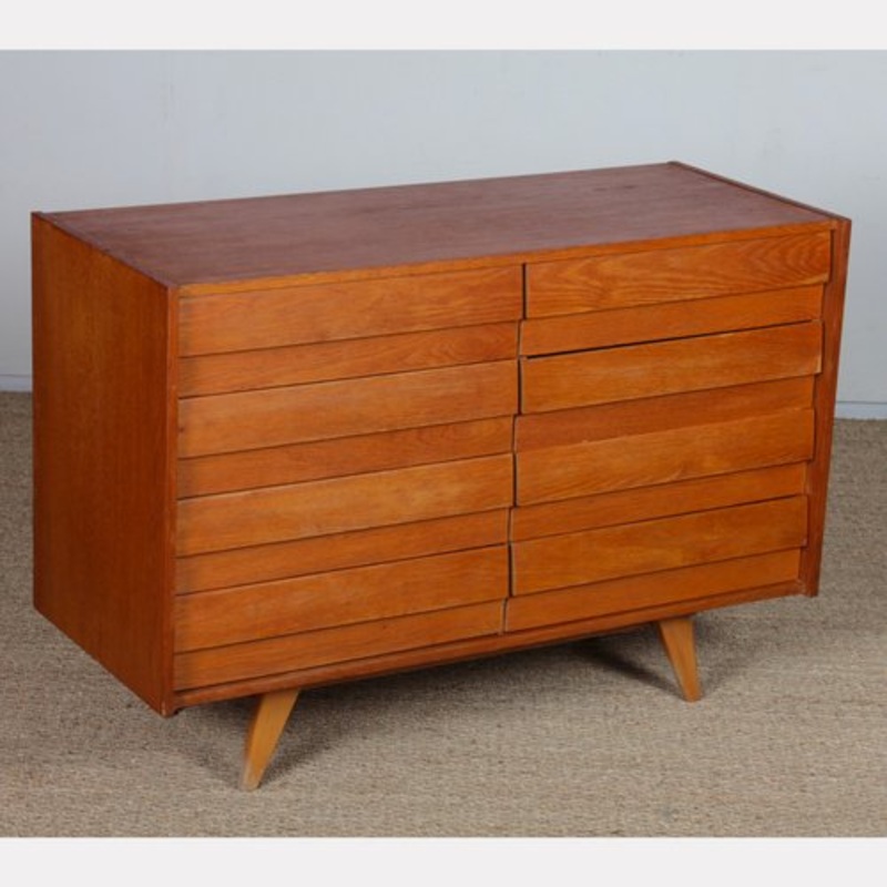 This wooden chest of drawers is designed by Jiri Jiroutek for the publisher Interier Praha. This is the U-453 model dating from the 1960s. It is made up of eight drawers with a wooden front and a molded plastic interior. This piece of furniture from the Cz