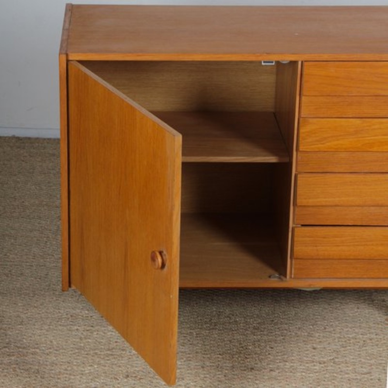 This vintage chest of drawers is designed by Jiri Jiroutek for the publisher Interier Praha. This is the U-458 model from the 1960s. This oak piece of furniture includes a door and a series of 4 drawers whose container is made of molded plastic. The box re