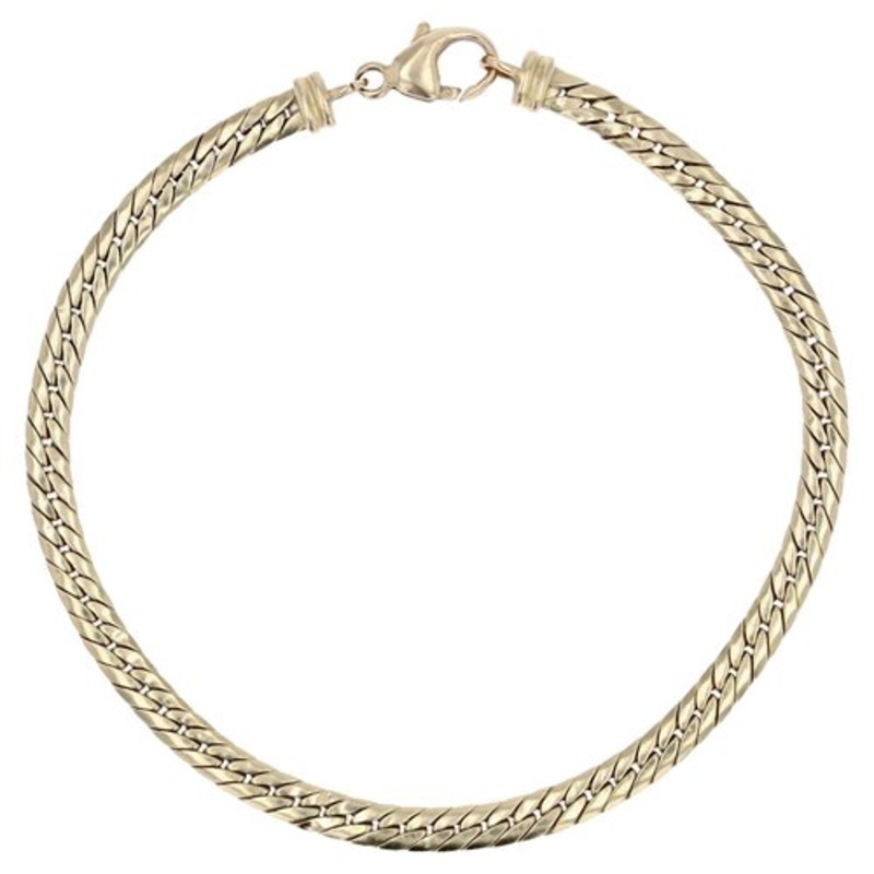 Bracelet in 18 karat yellow gold. This second-hand gold bracelet features a flattened gourmette link. The clasp is a snap hook. Length : 18,5 cm approximately, width : 3,4 mm approximately, interior circumference : 18 cm approximately. Total weight of the