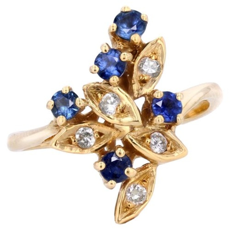 Ring in 18 karat yellow gold, eagle head hallmark. Asymmetrical in shape, the setting of this second-hand ring is set with five round sapphires held in claws and five modern brilliant-cut diamonds within small gold leaves. Height : 17.3 mm approximately, width : 11 mm approximately, thickness : 5.4 mm approximately, width of the ring at the base : 1.6 mm approximately. Total weight of the jewel : 3,3 g approximately.
