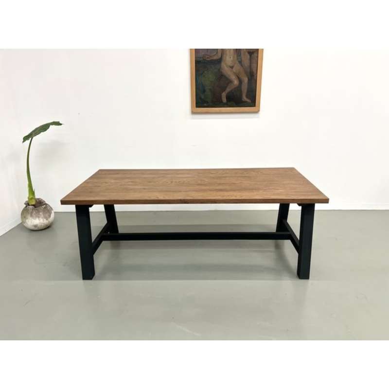 This pretty dining table with modern lines is 100% made of solid oak with a very graphic base. The whole thing is heavy and very robust and the oak top shows a nice grain.