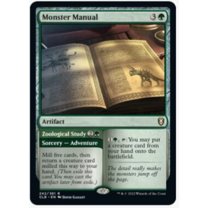 1G, T: You may put a creature card from your hand onto the battlefield.Zoological Study2GSorcery AdventureMill five cards, then return a creature card milled this way to your hand.(Then exile this card. You may cast the artifact later from exile.)Rarity:R#