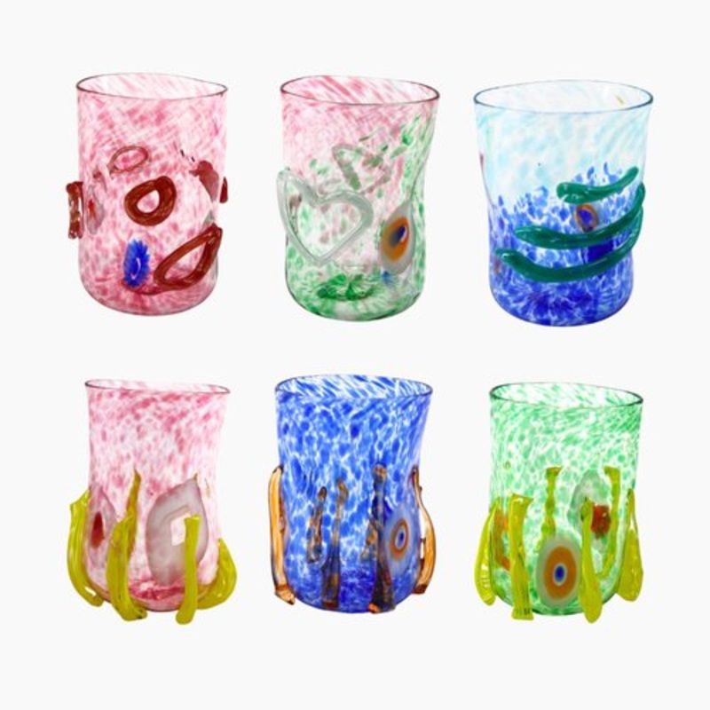 This set includes six unique glasses, each crafted to fit together perfectly in a vibrant mix of colors. Designed to create a luxurious yet playful ambiance, they bring a spirit of creativity to any space. Each handmade piece requires the skill of two murano glassmasters. Featuring a striking relief design, the glasses are also comfortable to hold, making them ideal for everyday use.