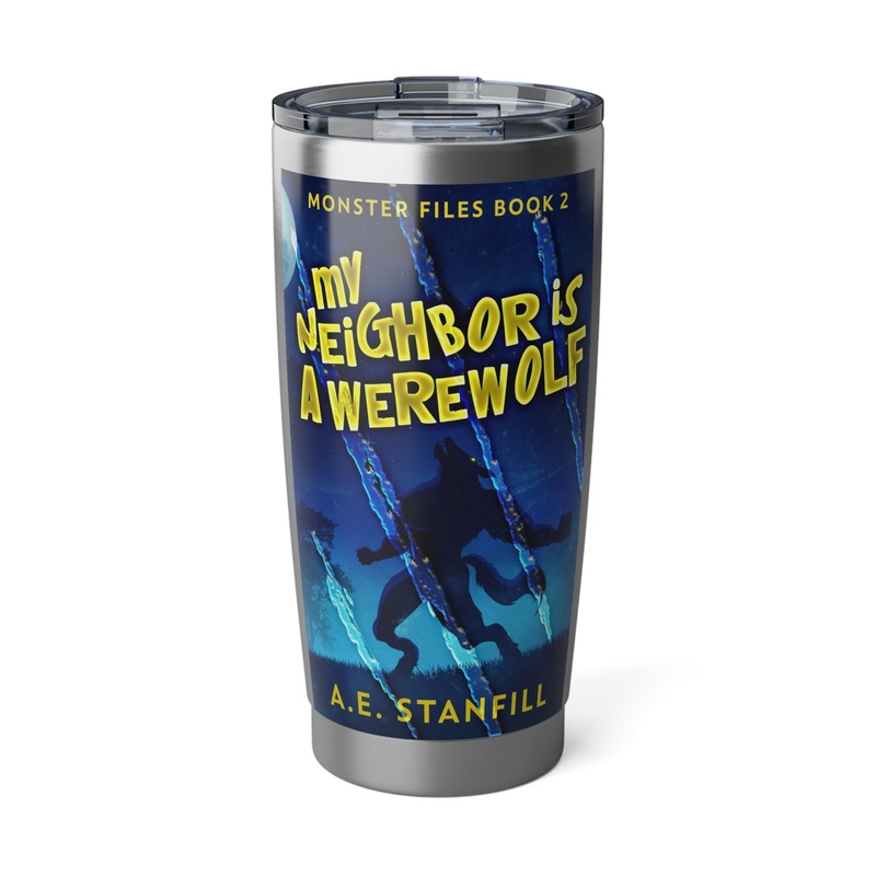 Minimize your plastic footprint with style. This tumbler fits perfectly into car cup holders, and the rubber gasket makes it spill-resistant on bumpier roads. The double-wall insulation makes sure drinks stay at the right temperature until the next pit stop. The cover art in this 20 oz tumbler is from A.E. Stanfill’s book, My Neighbor Is A Werewolf.