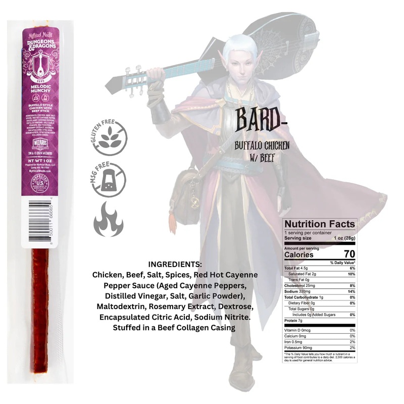 Treat your taste buds to a musical journey with Mythical Meats D&D – Bard “Melodic Munchy”! This unique snack combines the zesty flavor of buffalo style chicken with the savory goodness of beef stick. Perfect for adventurers on-the-go, this 1oz snack is sure to hit all the right notes (and satisfy your cravings)!